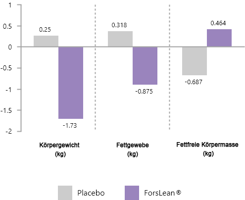 Die Effizienz von ForsLean® konnte in einer klinischen Doppelblindstudie bestätigt werden. Bei den Versuchspersonen wurde nach einer 12-wöchigen Einnahme von 250 mg ForsLean® ein bedeutender Rückgang des Körpergewichts und des Fettgehalts sowie eine bedeutende Zunahme der fettfreien Körpermasse im Vergleich zur Placebogruppe festgestellt.